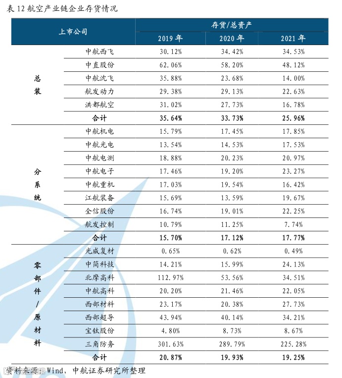 总装企业在产业链处于强势地位,占用大量上游企业占款。在军工装备生产过程中,配套企业以赊销的方式向总装企业提供分系统或配套零部件,总装企业负责装备研制,研制完成之后销售给军方用户。过程中,配套企业由于垫付生产分系统或零部件的生产费用,因此造成应收账款占营业收入比重过高;而同时总装企业由于接受了大量由配套企业提供的分系统或零部件,导致其存货占总资产比重过高。表11中,总装企业的应收账款占营业收入比重为18~32%,远远低于分系统企业的41%~54%和零部件/原材料企业的33%~37%。由于总装企业直接面对军方客户,因此能够通过上游占款的方式大幅提升经营性现金流,而配套企业由于应收账款过大,占用了大量的企业现金流导致财务费用率较高。