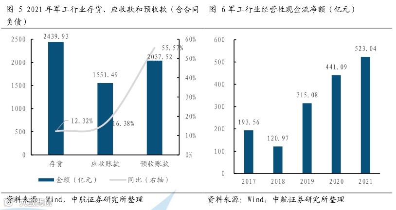 应收账款、存货增速平稳,预收账款(含合同负债)高速增长,经营性现金流净额达到近五年最高值。从资产负债表来看,2021年应收账款为1551.49亿元,同比增长16.38%;预收账款为2037.52亿元,同比增长55.57%;存货为2439.93亿元,同比增长12.32%。从现金流量表来看,经营现金流净额逐年向好,2021年达到近五年的最高值523.04亿元。预收账款主要来源于军工企业上游需求订单,我们认为预收账款超过50%的增速反映了“十四五”开局之年军工订单持续向好,军工景气度高涨。