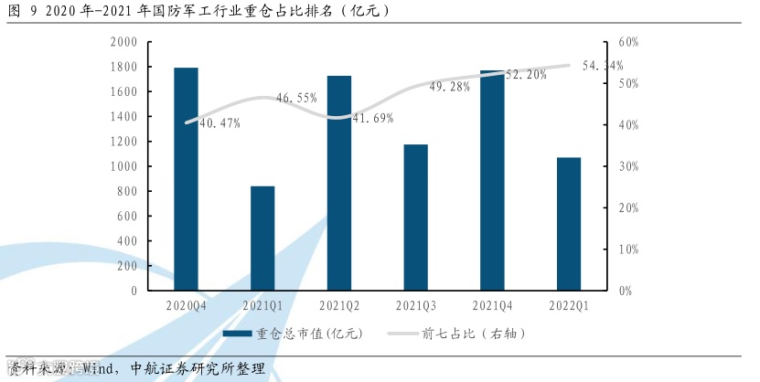 军工持仓个股趋于集中。近年来,基金前七大重仓个股的主动持仓比例已从2020Q4的40.47%提升至2022Q1的54.34%。机构的重仓个股配置趋于集中化,主要由于军工行业受益于国产替代加速和产能稳定释放,许多重点公司进入了业绩兑现周期,促使机构持仓集中于重点公司。