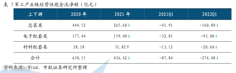 受产品交付加速、销售扩展和军品结算周期影响,军工行业经营性现金流净额为负。具体来看,材料配套类企业2021年经营性现金流净额与去年同期相比有所改善,而电子配套类、总装类企业2021年经营性现金流净额与去年同期相比下降明显。