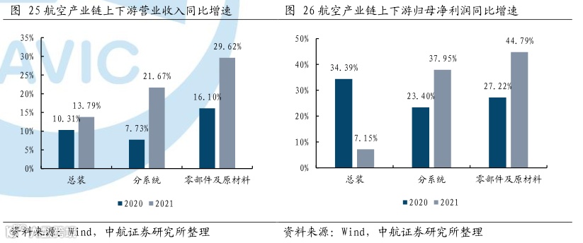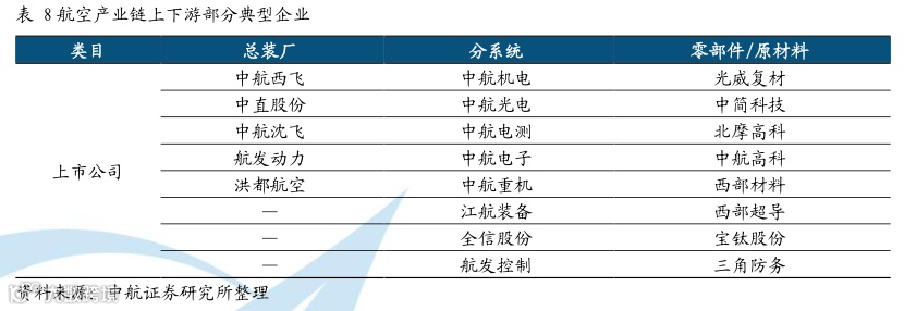 国防军工板块中,航空装备子板块的上市企业军品占比、资产证券化率最高,且上市公司产业链分布较为完整。因此,根据上市公司军品占比和所处产业链地位,我们选取了航空装备产业链中部分有代表性的总装企业、分系统配套企业、零部件及原材料配套企业,对其业绩情况进行整理统计分析,以进一步了解当下军工产业链景气程度及行业特点。