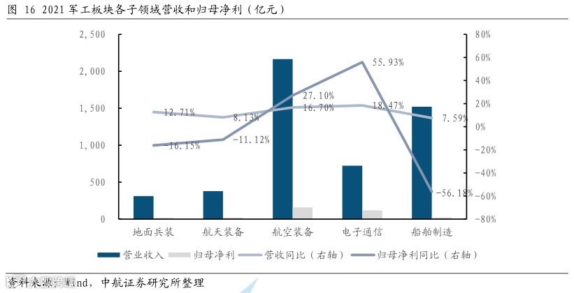 从各子板块来看,航空装备和电子通信表现亮眼。航空装备是十四五装备升级换装的核心,板块内资产证券化率较高,收入规模较大,板块在2021年实现营业收入和归母净利润分别为2,165.30亿元和157.78亿元,对应增速分别为16.70%和27.10%;电子通信板块受益于军品信息化发展和下游需求激增的驱动,营收和归母净利润723.09亿元和119.04亿元,增速分别为18.47%和55.93%,在各板块中位居首位;此外,受益于航运周期性复苏,各造船指标显著改善,船舶制造板块实现了较大规模的营收,但由于原材料价格高企和民品占比较高,板块盈利水平下滑明显。