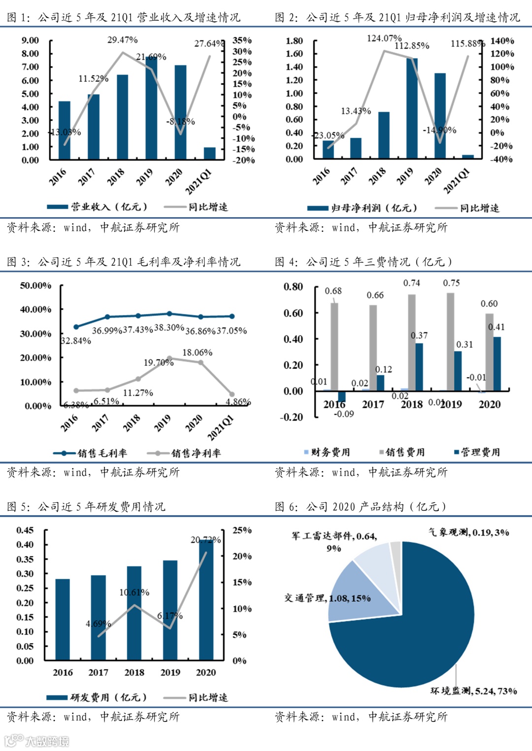 4、气象观测:实现收入0.19亿元(-44.24%),毛利率为57.12%(+5.75pcts)。核心产品主要包括地面观测仪器、大气成分观测仪器等。公司自主研发的DNQ2前向散射式能见度仪(全国取证企业共有3家)和DSG2降水现象仪(全国取证企业共有5家)取得了气象专用技术装备使用许可证。公司自主研制的能见度仪和颗粒物监测产品在中国气象局市场上具有领先的技术优势和较高的市场占有率。