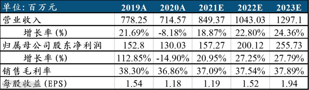 公司4月27日公告,2021年Q1营收0.95亿元(+27.64%),归母净利润0.06亿元(+115.88%),毛利率37.05%(-2.79pcts),净利率4.86%(+3.06pcts)。3月1日公告,2020营收7.15亿元(-8.18%),归母净利润1.30亿元(-14.90%),毛利率36.86%(-1.44pcts),净利率18.06%(-1.64pcts)。