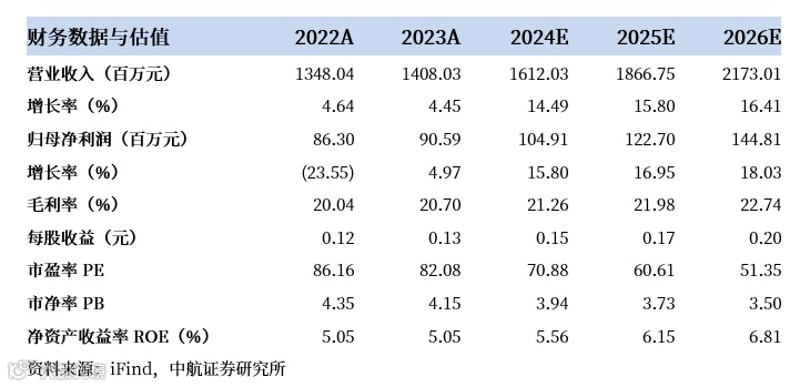 基于以上观点,我们预计公司2024-2026年的营业收入分别为16.12亿元、18.67亿元和21.73亿元,归母净利润分别为1.05亿元、1.23亿元及1.45亿元,我们维持“买入”评级,目标价为14.60元,对应2024-2026年PE分别为99倍,85倍和72倍。