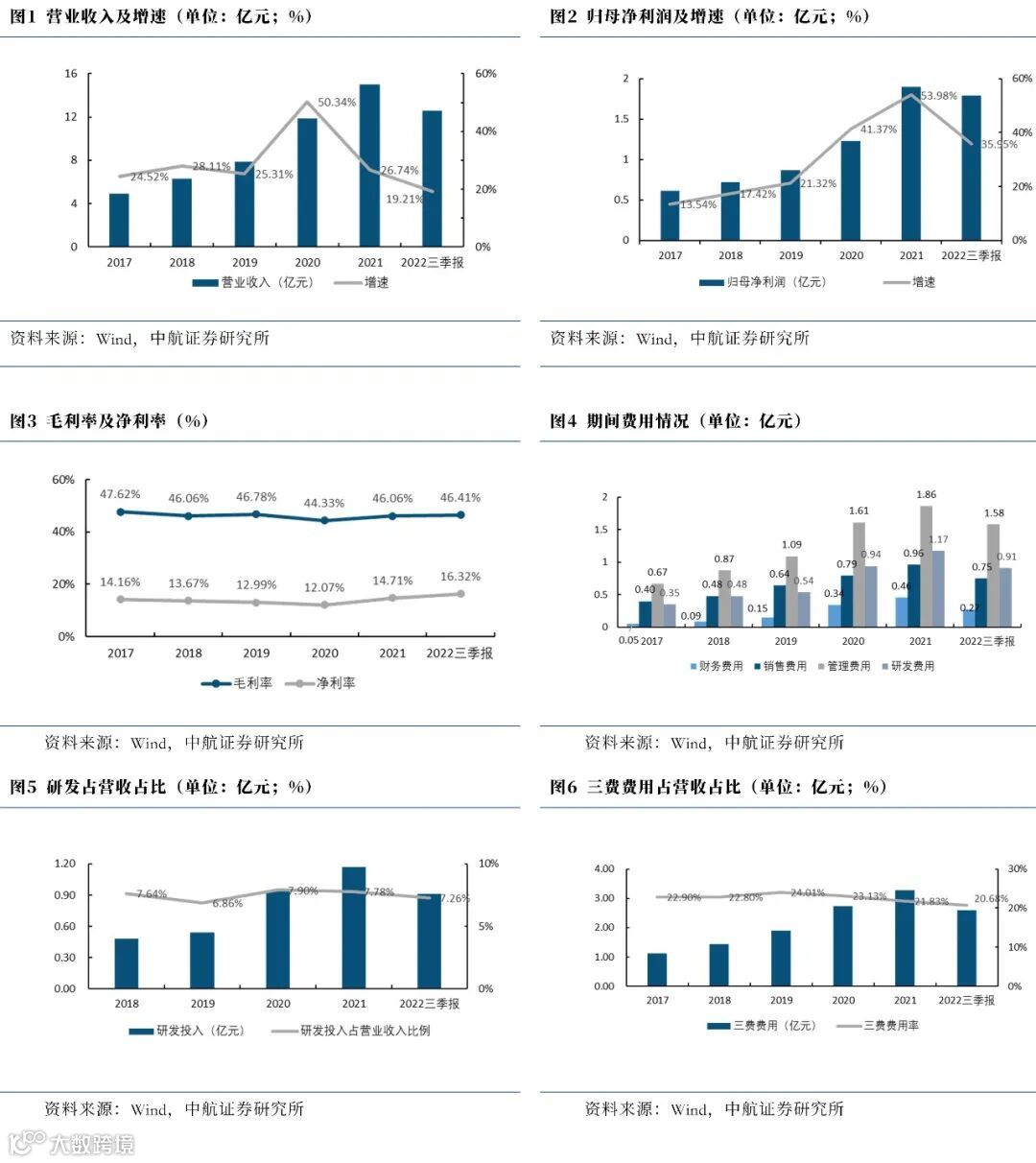 公司10月25日发布了2022年三季度报告,2022年前三季度营业收入12.60亿元(同比+19.21%),归母净利润1.79亿元(同比+35.95%),毛利率46.41%(同比+1.10pcts),净利率16.32%(同比+2.00pcts);2022 Q3营业收入4.61亿元(同比+20.68%),归母净利润0.72亿元(同比+45.13%),毛利率49.65%(同比+2.99pcts),净利率17.57%(同比+2.78pcts)。