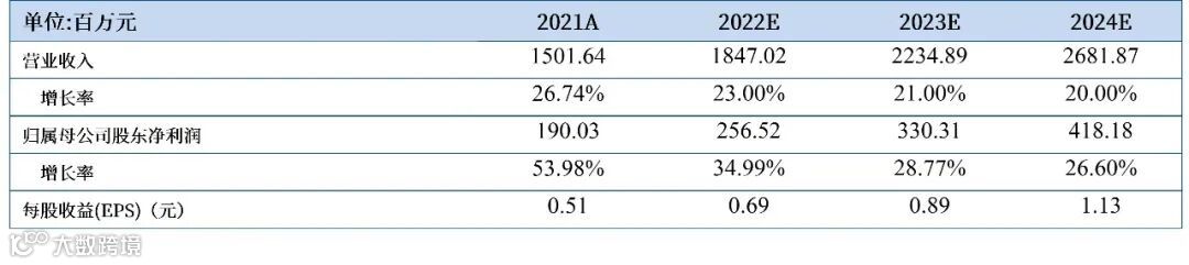 基于以上观点,我们预计公司2022-2024年的营业收入分别为18.47亿元、22.35亿元、26.82亿元,归母净利润分别为2.57亿元、3.30亿元、4.18亿元,EPS分别为0.69元、0.89元、1.13元,维持“买入”评级,2022年10月27日收盘价35.47元,对应2022-2024年PE分别为51.41倍、39.85倍、31.39倍。