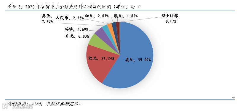 与美债海外投资者持有比例下降相伴的是,2008年之后全球的黄金储备持续提升。2019年世界黄金协会的调查显示,已有13%的央行表示“去美元化”与他们投资黄金的决定高度相关或一定程度上相关。各国央行通过分散资产配置来实现“去美元化”导致美元在全球外汇储备中的占比趋降,2020年末已降至59%,创出新低。