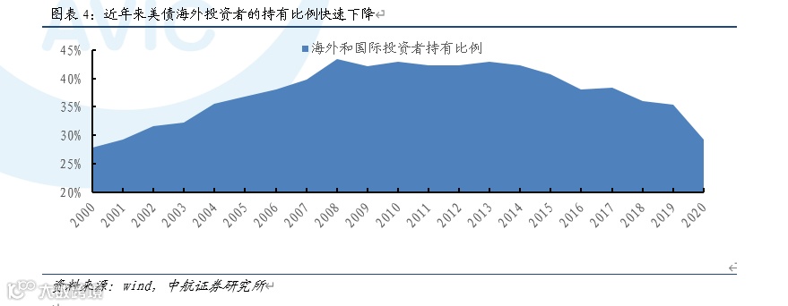从美国国债的持有人结构来看,08年金融危机后,美债的吸引力下降,各国不再大量加持美债,外国投资者持有美国国债的占比自2008年金融危机期间达到约43%的峰值以来一直在减少,2020年更是加速下跌至30%以下。在2011年3月末至2021年3月末的10年里,美国国债总额从14.27万亿美元飙升到28.13万亿美元,但美债的最大持有者日本和中国的持有额几乎没有增长。而曾大量持有美债的俄罗斯近几年近乎清仓式地抛售美债,并在2019年消失在前十大持有名单中。这种变化可能反映了非美国家对美国债务信心趋于下降,持有美债意愿日渐趋弱,未来的大部分美债将由美国的国内投资者来买单,美联储作为美债国内的最大买家将面临越来越大的压力。