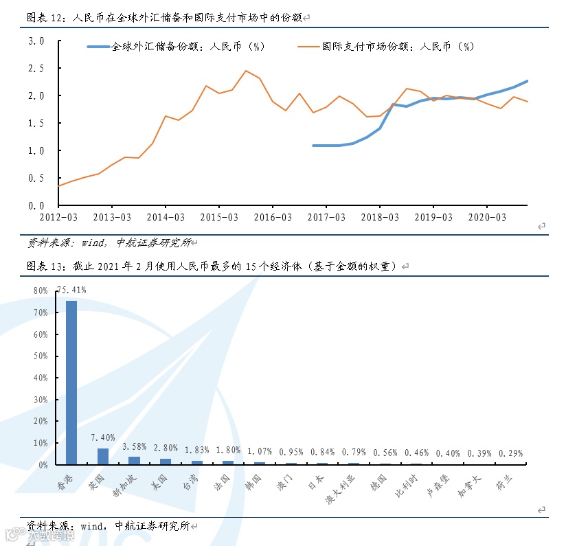 人民币国际化进程在2015年811汇改之后有所放缓,这与811汇改后央行逐步退出日常干预,人民币中间价定价机制的透明化与市场化程度提升,人民币汇率双向波动幅度加大,央行加大力度打击人民币跨境套利,国内经济潜在增速趋降,政策愈发重视金融防风险等因素有关。目前人民币在全球外汇储备和国际支付中的占比仍处于2%左右的较低水平,且境外使用主要集中在香港,反映人民币国际化仍处于初级阶段。新一轮美元泛滥与中美博弈加剧,对人民币国际化来说既是机遇也是挑战,目前国内政策方针强调“做好自己的事”,政策重点在国内各领域改革上发力,叠加外部国际环境趋紧,预计短期内人民币国际化进程难以出现明显加速,但新发展格局的构建与中国在全球经济权重的提升均暗含了对人民币国际地位提升的需求,人民币国际化在长期内持续推进仍是大势所趋。