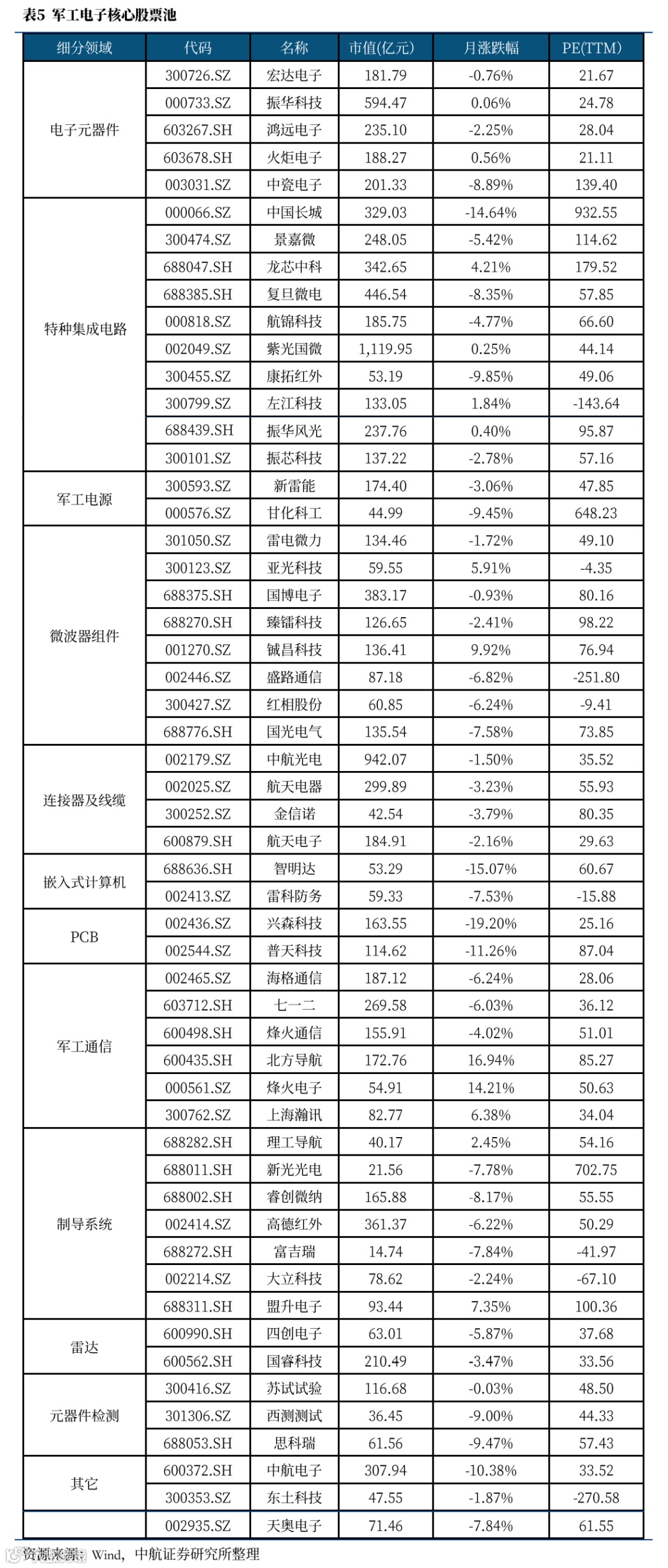 紫光国微(特种芯片);大立科技(红外制导);新雷能(军工电源);雷电微力、国博电子(TR组件);振华科技(军工电子元器件);火炬电子、鸿远电子、宏达电子(高端电容);智明达(嵌入式计算机);中国软件、中国长城(信创);国睿科技(雷达整机)。