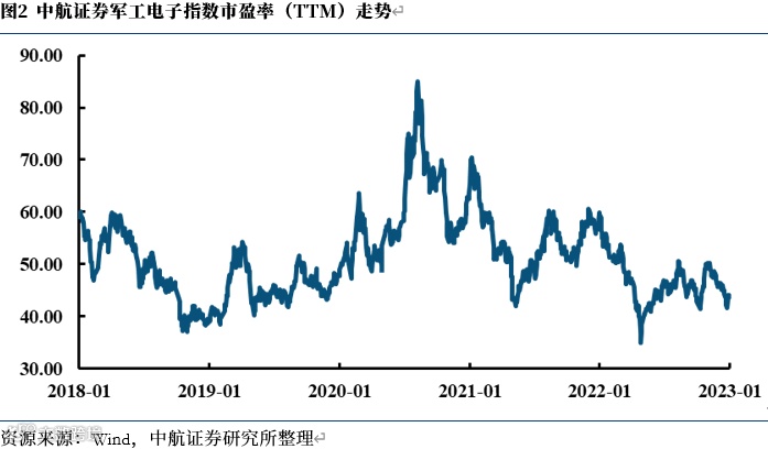 我们对中航证券军工电子指数标的进行PE(TTM)统计,截至2022年12月末指数市盈率为44.11倍,较上月下降3.49%,处于2018年以来的17%分位。