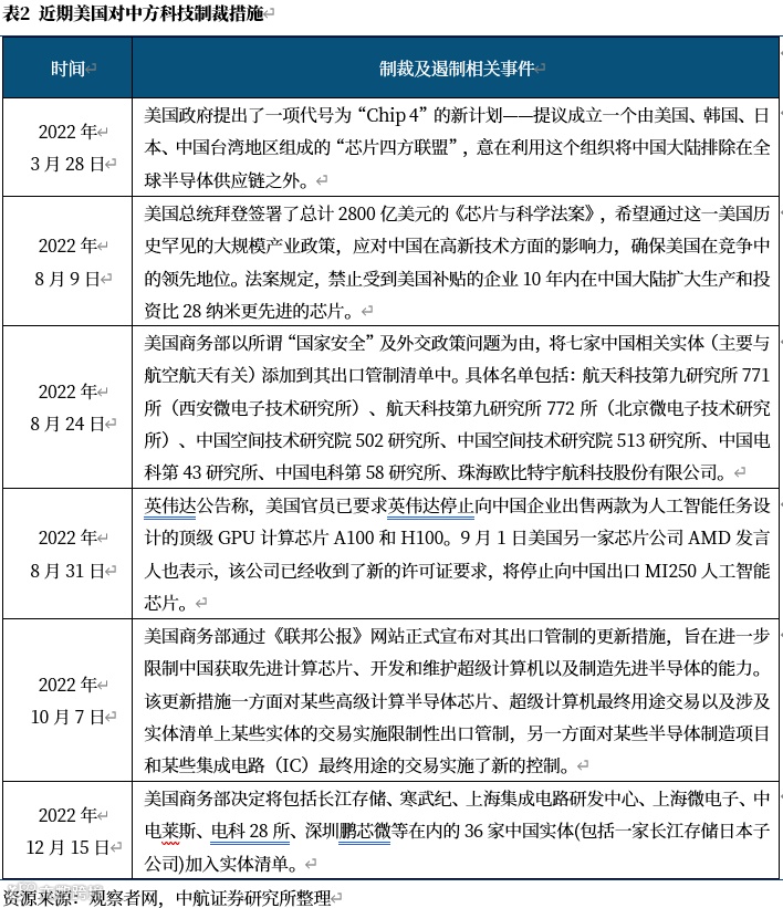 2、美制裁持续加码下的自主可控机会。从2022年下半年美对中的科技制裁动作来看,其力度不断加码,制裁措施已从行政指令上升到立法禁止,制裁范围已从半导体扩展到人工智能、高性能计算、新能源汽车,制裁对象已从对企业制裁延伸到禁止人员交流。军工行业具有天然的“自主可控”属性,在芯片法案和近期相关制裁事件后,国产替代的进程将更为坚定,或进一步提速。