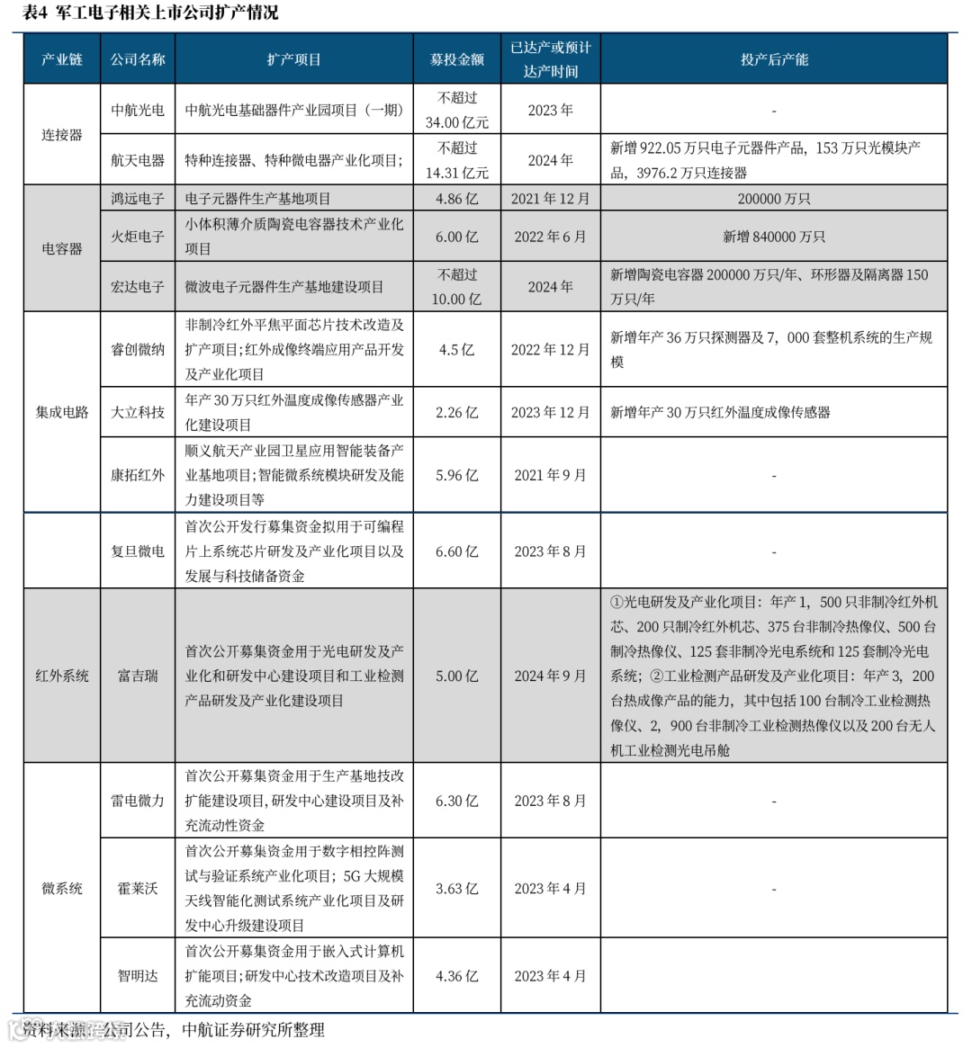 “十四五”期间,军工电子行业在以上高需求背景下,供给侧也将呈现积极扩产态势,军工电子领域企业募投金额超百亿,景气度无忧。在目前军工电子整体供不应求的环境下,军工电子产业链公司相继出台了扩产计划,我们统计了军工电子领域上市公司的扩产计划及IPO募投情况,其中包括连接器、电容器、集成电路、红外、红外系统、微系统领域均出现公司扩产,合计募投金额超百亿。在考虑到新产能爬坡的情况,我们预计军工电子“十四五”期间景气度整体无忧。
