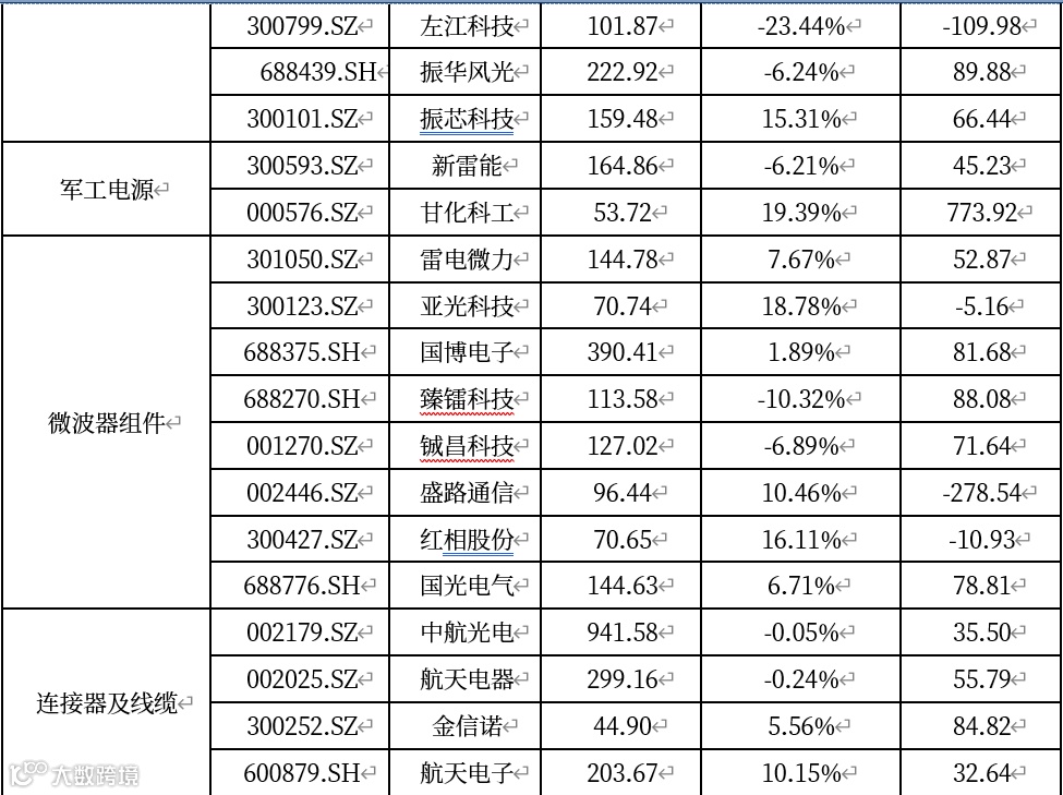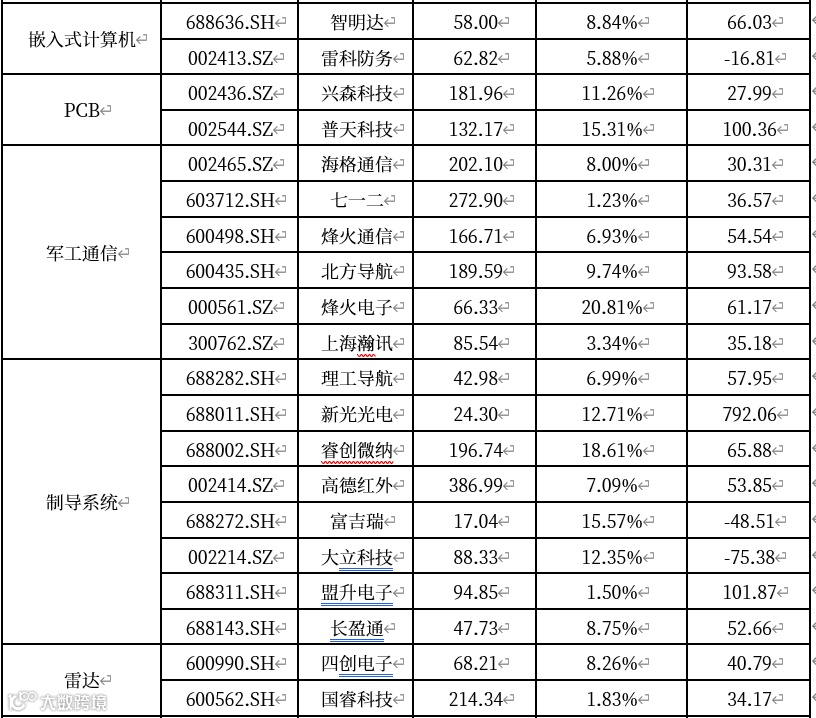 紫光国微(特种芯片);大立科技(红外制导);长盈通(惯性制导);新雷能(军工电源);雷电微力、国博电子(TR组件);振华科技(军工电子元器件);火炬电子、鸿远电子、宏达电子(高端电容);智明达(嵌入式计算机);中国软件、中国长城(信创);国睿科技(雷达整机)。