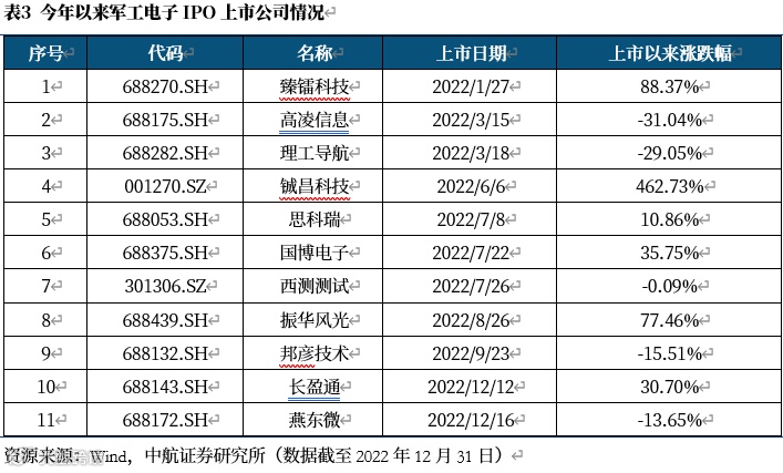 2022年12月长盈通、燕东微两家军工电子企业相继上市。随着科创板、注册制以及北交所的推出等,大幅降低了军工企业上市门槛,得益于十四五军工高景气,相关核心军工电子上市公司持续上市,同时涌现出更多的投资机会,一些核心军工电子次新股表现出众,如铖昌科技、臻镭科技、振华风光、国博电子等。