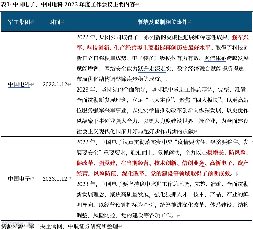 2023年1月,中国电子及中国电科召开了2023年年度工作计划会,作为军工电子的主力军,两大集团企业2022年保持了较好的发展态势,尤其是中国电科,在生产经营等主要指标再创历史最好水平,其经营情况对军工电子产业整体景气度具有指引意义。