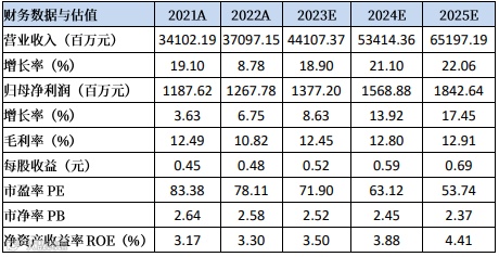 我们预计公司2023-2025年的营业收入分别441.07亿元、534.14亿元和651.97亿元,归母净利润分别为13.77亿元、15.69亿元及18.43亿元,EPS分别为0.52元、0.59元、0.69元,我们维持买入评级,目标价43元,对应2023-2025年预测EPS的83倍、73倍、及62倍PE。