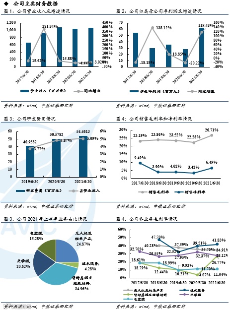 无人机业务下滑,盈利能力提升来自光伏背板背材用膜:报告期内,公司整体营收规模保持稳定,盈利能力大幅提升,实现营业收入10.70亿元(+3.02%),归母净利润0.63亿元(+119.48%),扣非归母净利润0.62亿元(+165.36%),毛利率26.71%(+4.43pcts),净利率6.49%(+3.07pcts),毛利率水平创近五年同期最高,增长的主要贡献来自新材料业务中的光伏背板背材用膜。报告期内,公司国内业务实现营业收入8.86亿元(+13.60%),国外业务1.83亿(-28.97%)。