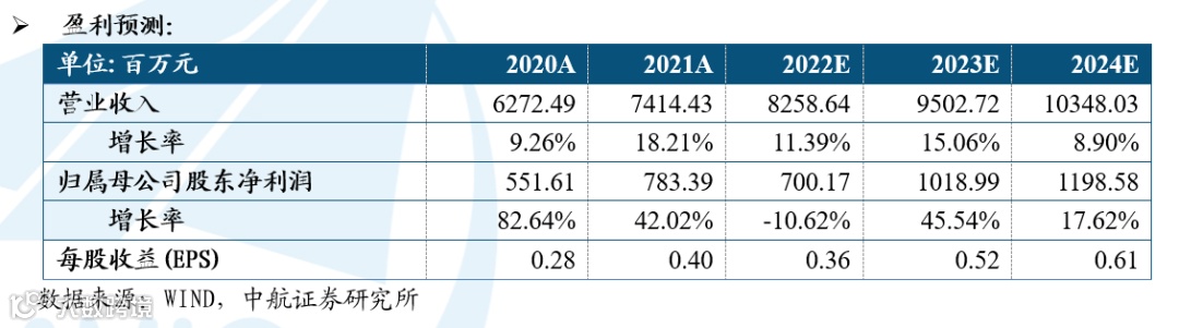 基于以上观点,我们预计公司2022-2024年的营业收入分别为82.59亿元、95.03亿元和103.48亿元,归母净利润分别为7.00亿元、10.19亿元及11.99亿元,EPS分别为0.36元、0.52元、0.61元,我们给予买入评级,目标价25元,对应2022-2024年PE分别为69、48、41。