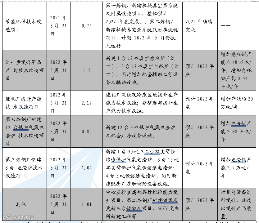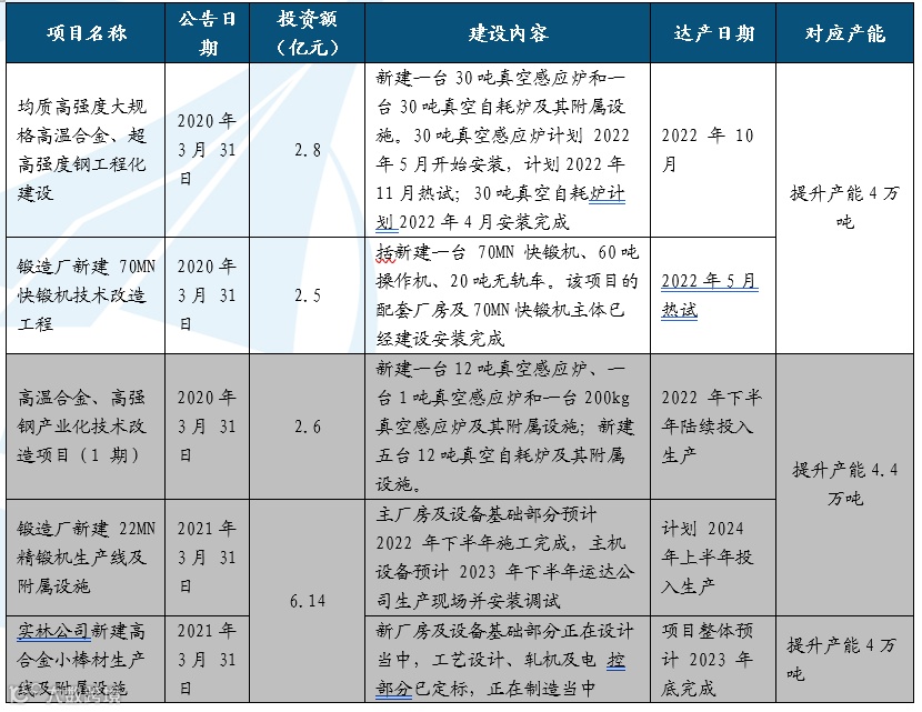 公司同时披露新扩产计划,预计投入10.76亿元,主要用于高温合金、超高强度钢的能力建设,建设期为2022-2023年。