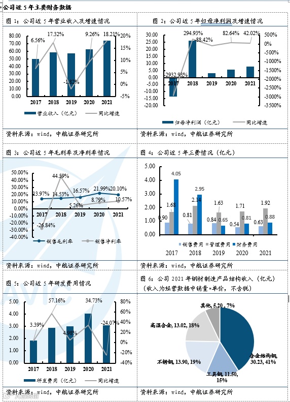 公司结合当下原材料价格和能源动力价格,预计2022 年公司计划实现钢产量 68 万吨至 74 万吨、钢材产量 54 万吨至 60 万吨,其中“三高一特”核心产品 7.5 万吨至 8.5 万吨;实现营业收入 80亿元至 88 亿元,实现净利润 5 亿元至 8 亿元。