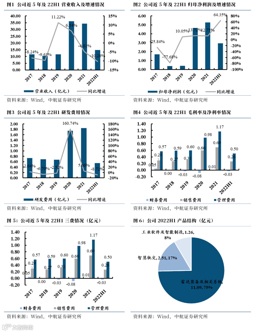 “A股市场雷达技术最为先进、产品品类最为齐全的上市公司”:公司背靠十四所及国睿子集团,2020年通过重大资产重组形成了雷达装备、智能制造两大发展领域业务。其中以国睿防务为核心的雷达装备业务已经成为公司的核心业务(22H1收入贡献75%,净利润贡献95%),目前公司为国内外用户提供全谱系预警探测装备及系统产品,包括机载火控、机载预警、武器定位、武器制导、反隐身情报、靶场测控等防务雷达,近程及远程一、二次空管雷达,测风测雨测云等气象雷达及气象应用系统。
