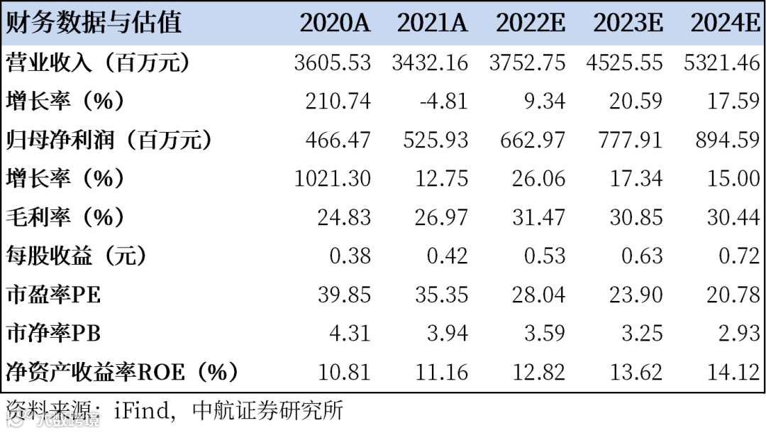 1.公司背靠中电科14所以及国睿子集团,技术实力雄厚;2.重大重组后,公司成为A股市场雷达技术最为先进、产品品类最为齐全的上市公司,盈利规模和质量上新台阶;3.疫情对军贸冲击减弱,全球安全需求增加,公司军贸新签合同额创历史同期新高,公司军贸业务有望持续向好;4.科技创新成果显著,有望给公司业绩增长持续提供新动能。我们预计公司2022-2024年的营业收入分别为37.53亿元、45.26亿元和53.21亿元,归母净利润分别为6.63亿元、7.78亿元和8.95亿元,EPS分别为0.53元、0.63元和0.72元。我们维持“买入”评级,目标价19.32元,对应2022-2024年预测EPS的36倍、31倍及27倍PE。