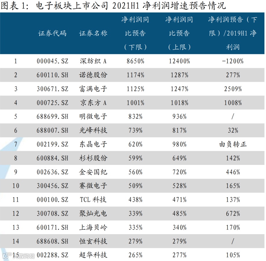 截至本周末,超过百家上市公司发布业绩预告,净利润预告同比下限和上限中位数分别为79%和94%,总体呈现业绩高速增长态势,电子行业高景气度的持续得到确认。剔除疫情可能带来的影响,2021H1(预告下限)相比2019H1净利润增速整体相比今年业绩预告呈现更大幅度的增长,说明今年业绩的快速提升主要由于市场需求的扩大与产能提升速度不匹配造成供需失衡而导致的半导体上市公司业绩爆发。