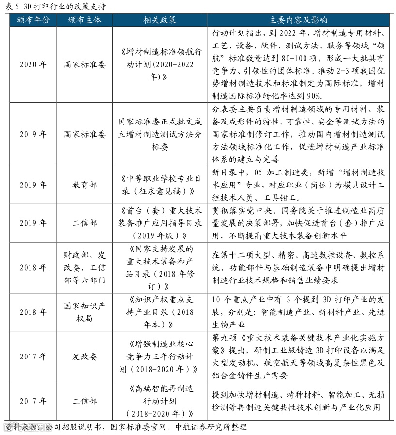 政策利好助力增材制造产业发展。我国高度重视增材制造产业,将其作为《中国制造2025》的发展重点。早在2015年,工信部、发改委、财政部联合印发了《国家增材制造产业发展推进计划(2015-2016年)》,通过政策引导,在社会各界共同努力下,我国增材制造关键技术不断突破,装备性能显著提升,应用领域日益拓展,生态体系初步形成,涌现出一批具有一定竞争力的骨干企业,形成了若干产业集聚区,增材制造产业实现快速发展。为有效衔接上述计划,应对增材制造产业发展新形势、新机遇、新需求,推进我国增材制造产业快速健康持续发展,2020年国家标准委制定了《增材制造标准领航行动计划(2020-2022 年)》,明确“到2022年,增材制造专用材料、工艺、设备、软件、测试方法、服务等领域“领航”标准数量达到80-100项,形成一大批具有竞争力、引领性的团体标准。推动2-3项我国优势增材制造技术和标准制定为国际标准,增材制造国际标准转化率达到90%”各地方政府也出台多项政策举措,支持增材制造产业的快速发展。