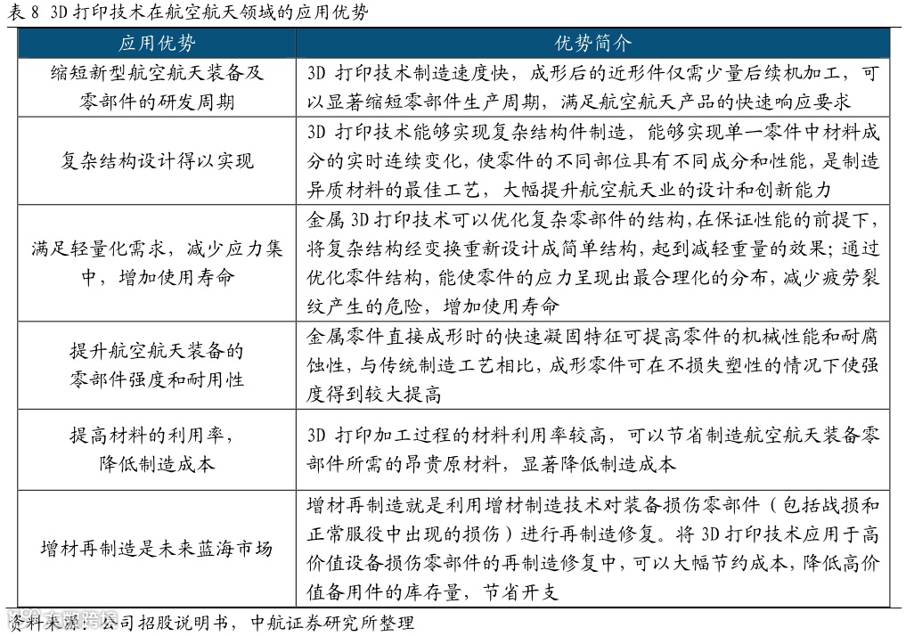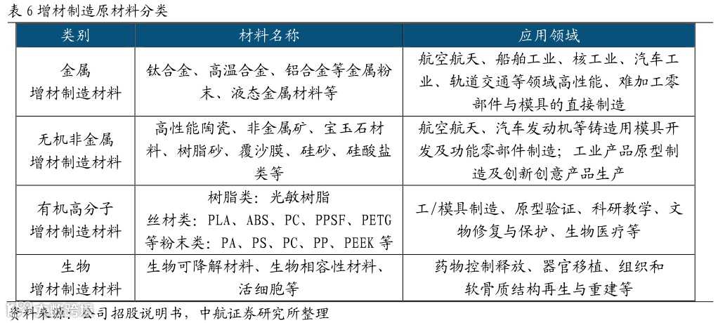西安铂力特增材技术股份有限公司(铂力特,688333.SH)成立于2011年,是一家专注于工业级金属增材制造(3D打印)的高新技术企业,为客户提供金属增材制造与再制造技术全套解决方案。作为国内增材制造行业早期的参与者之一,公司通过多年技术研发创新及产业化应用,在金属增材制造领域积累了独特的技术优势。公司围绕金属增材制造产业链,开展金属3D打印设备、金属3D打印定制化产品及金属3D打印原材料的研发、生产、销售,同时向客户提供金属3D打印工艺设计开发及相关技术服务,构建了较为完整的金属3D打印产业生态链,整体实力在国内外金属增材制造领域处于领先地位。公司产品及服务广泛应用于航空航天、工业机械、能源动力、科研院所、医疗研究、汽车制造、船舶制造及电子工业等领域,尤其在航空航天领域,市场占有率较高,公司已成为空中客车公司金属增材制造服务的合格供应商