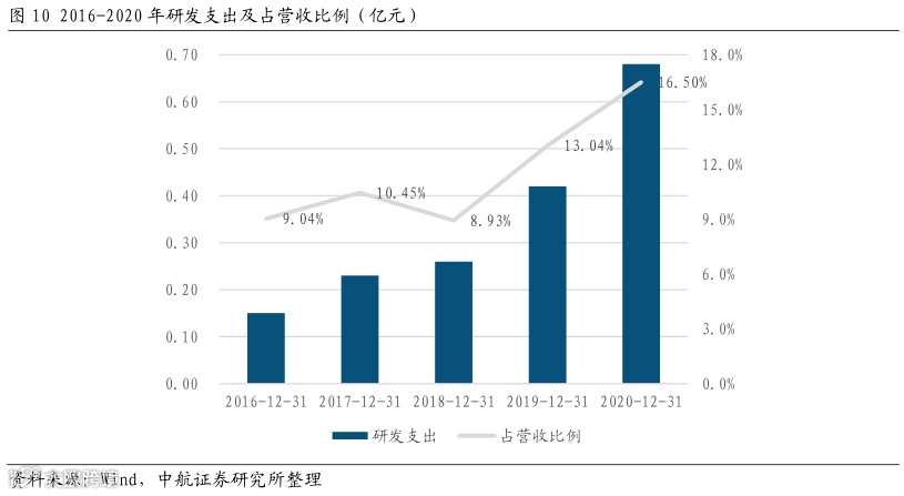 公司重视自主创新,持续加大研发力度。2018-2020年,公司研发支出不断增加,分别为0.26亿元、0.42亿元、0.68亿元,占营业收入的比例分别为8.93%、13.04%、16.50%。截至2020年,公司已累计申请专利327项,拥有授权专利153项,其中发明专利51项,实用新型专利88项,外观设计专利14项。