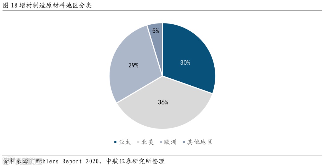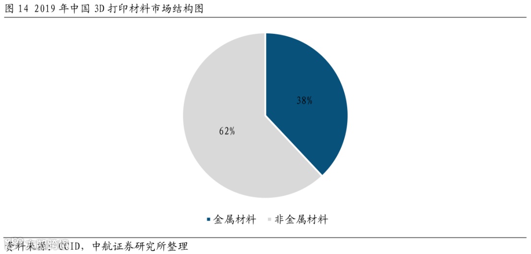 金属增材制造专用材料占比较大、研发活跃。在3D打印材料中,金属材料占比较大,根据CCID公布的数据显示,2019年,中国3D打印材料产业结构中,非金属材料产业规模25.38亿元,占比最高,达到62%;金属材料产业规模15.56亿元,占比38%。随着金属3D打印零件生产量的增加,市场上金属粉末材料种类偏少、专用化程度不够、供给不足的弊端也日益显现,其潜在的缺乏高品质、无缺陷的金属粉末问题也更加突出。针对金属增材制造专用材料展开的研发正日趋活跃。