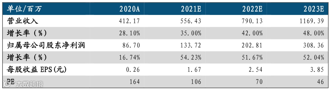2. 3D打印设备及配件(自研):公司加强研发投入,开发新设备,提升设备生产效率,并积极发掘新的应用领域,扩大设备销售市场。预计2021-2023年营收增速分别为41%/46%/50%。