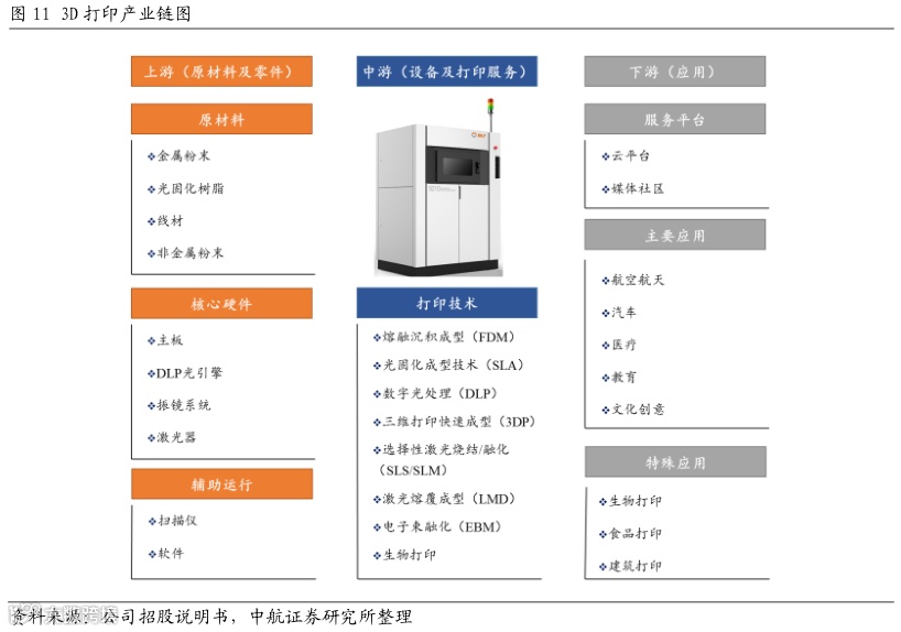 经过30余年的发展,3D打印已经形成了一条完整的产业链。上游涵盖三维扫描设备、三维软件、增材制造原材料类及3D打印设备零部件制造等企业,中游以3D打印设备生产厂商为主,大多亦提供打印服务业务及原材料供应,在整个产业链中占据主导地位,下游行业应用已覆盖航天航空、汽车工业、船舶制造、能源动力、轨道交通、电子工业、模具制造、医疗健康、文化创意、建筑等各领域。