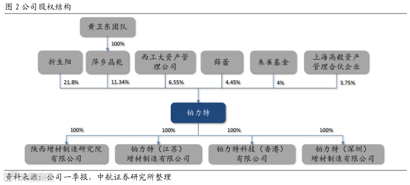 公司实际控股人为折生阳、薛蕾、黄卫东。截至2021年一季度,铂力特的前三大股东分别为西工大校友折生阳(21.8%)、黄卫东团队控股的萍乡晶乾商务信息咨询合伙企业(11.34%)和西工大资产管理公司(6.55%),折生阳、薛蕾、黄卫东为公司实际控制人。公司同时拥有三家全资子公司,子公司主要业务是增材制造成套设备研制和销售,激光加工及新料技术开发和代理销售德国EOS设备等。