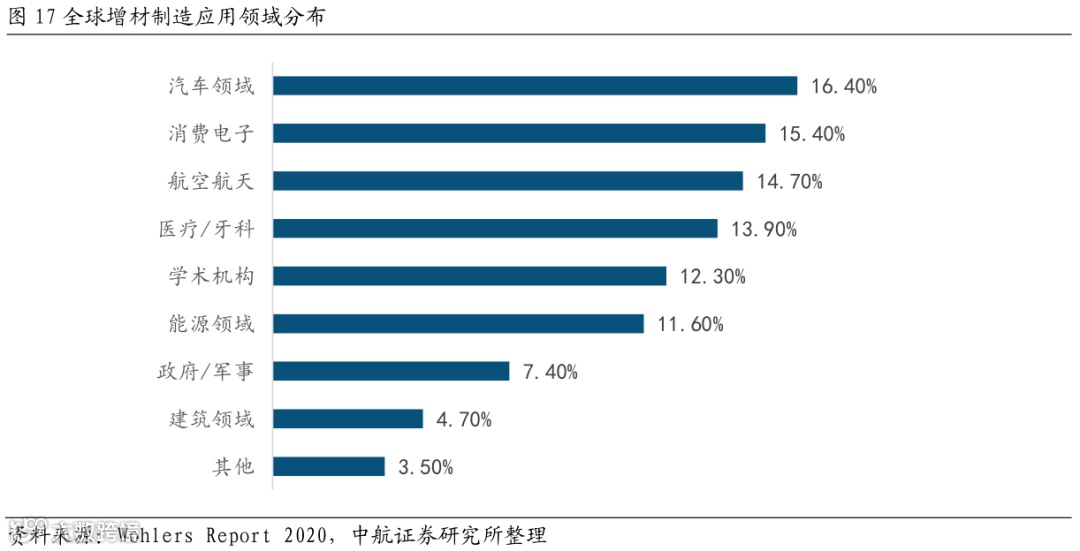 增材制造下游市场应用场景丰富。根据Wohlers Report 2020报告显示,2019年,增材制造主要应用于航空航天、汽车、消费电子、医疗/牙科领域,上述行业在增材制造整体应用领域的份额占比合计接近60%。增材制造已经成为航空航天等高端设备制造及修复领域的重要技术手段,并逐步成为产品研发设计、创新创意及个性化产品的实现手段以及新药研发、临床诊断与治疗的工具。