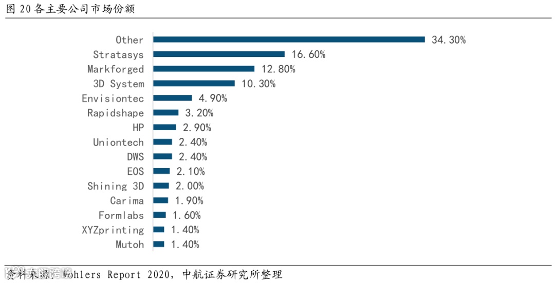 企业层面,技术之间的竞争向公司之间的竞争演变。行业发展初期,各项技术独立发展,市场也相对独立,企业之间不存在竞争关系。随着技术的发展,应用面扩大,不同技术之间开始竞争。当行业整合加剧,单一技术企业数量减少,技术间的竞争逐渐转变为少数拥有多项技术的企业之间的竞争。目前3D打印行业内部的竞争主要集中在设备厂商之间,这些设备厂商同时也提供3D打印的相关服务。在2019年,Stratasys、Markforged、3DSystem三家公司所占市场份额近40%,Stratasys销售了3660台工业3D打印机,占比为16.6%;值得注意的,“其他”的占比从2018年的30.3%上升到34.3%。这表明有更多的公司进入到这个领域。