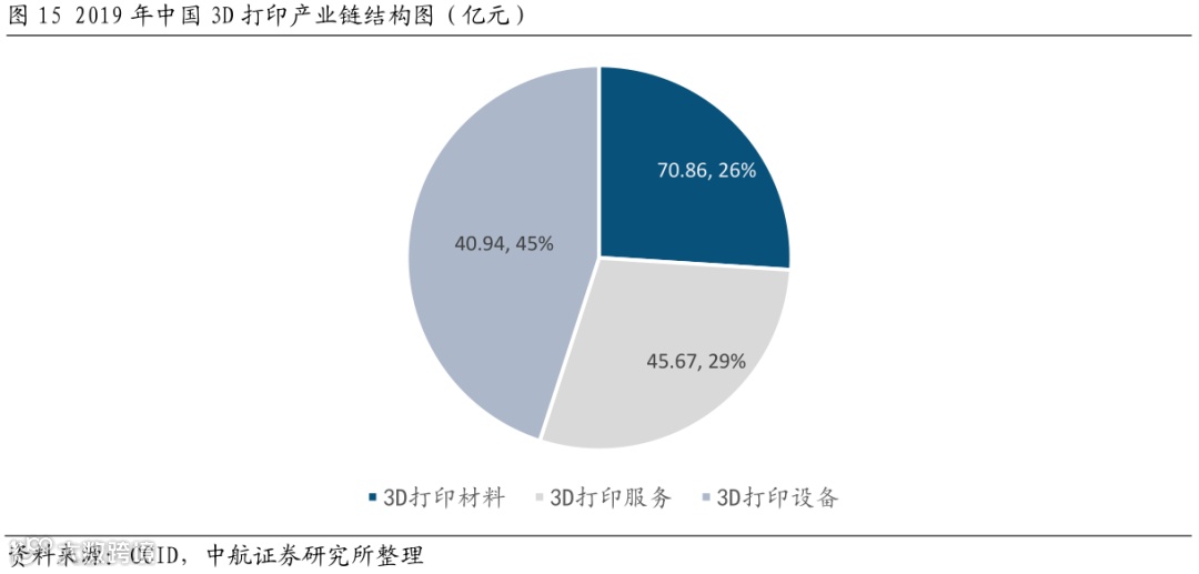 增材制造设备是3D打印产业链的中游,产业规模占比最大。3D打印产业主要由3D打印设备、3D打印材料和3D打印服务三大细分行业构成,根据赛迪顾问数据,我国3D打印产业规模于2019年达到157.5亿元,同比增加31.1%,快于全球整体增速;3D打印设备产业规模70.86亿元,占比最高,达到45%;3D打印服务产业规模为45.67亿元,占比29%;3D打印材料产业规模40.94亿元,占比26%。