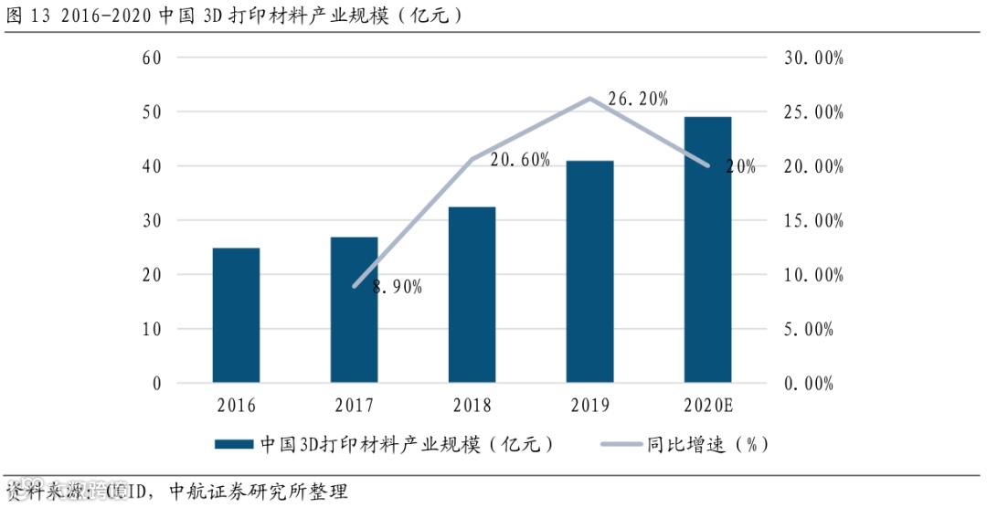 3D打印技术发展拉动原材料需求增长。近年来,随着3D打印技术的快速发展,原材料的需求持续增长。根据2020年3月赛迪顾问发布的《2019年全球及中国3D打印行业数据》,2019年,中国3D打印材料产业规模达40.94亿元,比2018年增长26.2%,在3D打印产业中占比26%。