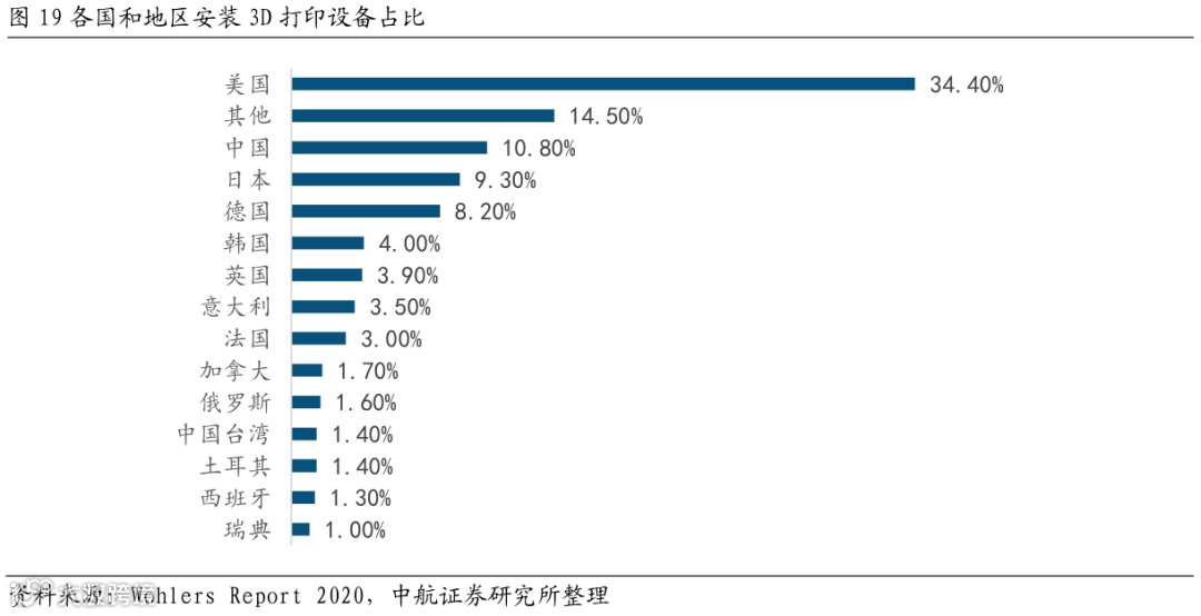 西方国家主导,亚洲国家追赶。依据Wohlers Report2020报告中2019年的3D打印设备装机量数据,美国遥遥领先,约为中国的3倍,中国的占比为10.8%,仅次于美国,占据第二位。美国、中国、日本和德国等国的3D打印设备安装数量保持领先于其他国家。全球增材制造产业已基本形成了美、欧等发达国家和地区主导,亚洲国家和地区后起追赶的发展态势。美国率先将增材制造产业上升到国家战略发展高度,引领技术创新和产业化。欧盟及成员国注重发展金属增材制造技术,产业发展和技术应用走在世界前列。俄罗斯凭借在激光领域的技术优势,积极发展激光增材制造技术研究及应用。日本全力振兴增材制造产业,借助增材制造技术重塑制造业国际竞争力。