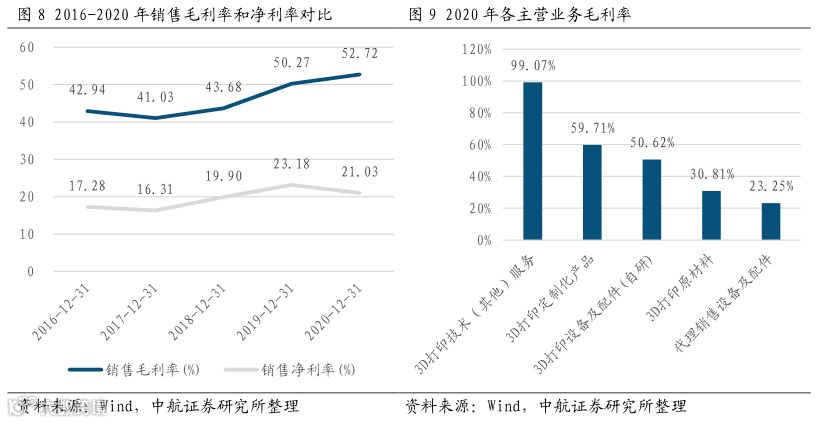 公司近两年毛利率稳定在50%以上。公司业务分布在3D打印的全产业链,主营业务包括3D打印原材料、3D打印设备及配件(自研)、代理销售增材制造设备及配件、3D打印定制化产品和3D打印技术服务,分别对应3D打印产业的上游原材料零部件供应、中游设备制造与下游行业应用。2018-2020年公司销售毛利率分别为43.68%、50.27%和52.72%。2020年,占公司营收最大的三部分:3D打印定制化品、3D打印设备及配件、代理销售增材制造设备及配件的毛利率分别为59.71%、50.62%和23.25%。值得一提的是,3D打印设备服务及配件(自研)以其销量增速快和利润率较高的特点正成为公司业务的新增长点。