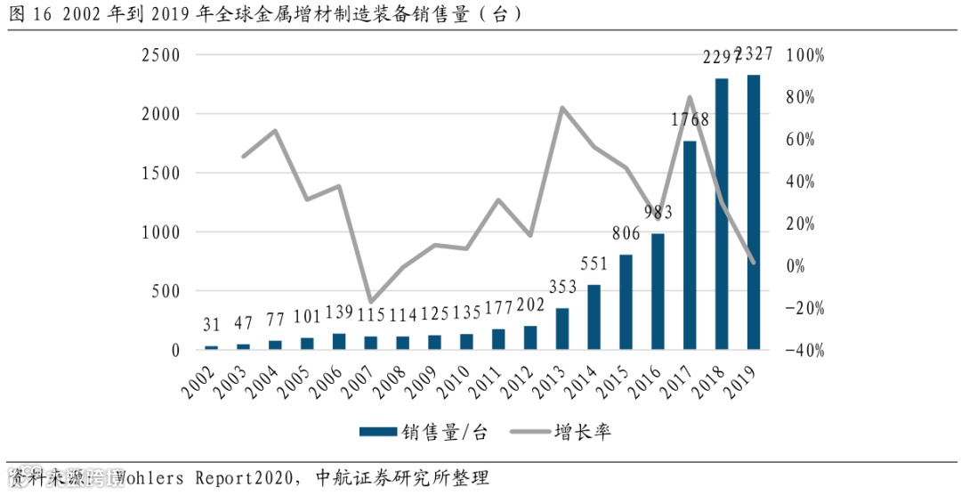 全球工业级增材制造装备销量稳步增长。金属增材制造装备销量大幅提升是得益于金属增材制造技术的成熟和低价金属增材制造装备的普及。根据Wohlers Associates,Inc.统计,特别是在2012年到2019年间,全球金属增材制造装备销量迅速增长,在2019年达到了大约2327台金属打印机。新的增材制造装备制造商也正进入增材制造市场,并带来如开放材料系统等先进的技术设备,以更快的打印速度和更低的价格,使金属增材制造变得越来越易于被市场接受。