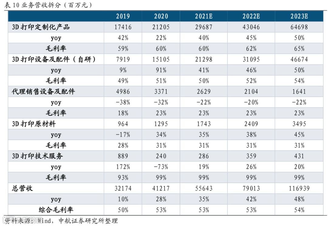 1. 3D打印定制化产品:公司持续深耕航空航天业务,持续提升工艺技术,开发新产品,预计2021-2023年营收增速分别为40%/45%/50%。