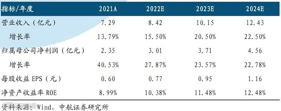 我们预计公司2022-2024年归母净利润分别为3.01亿元、3.71亿元和4.56亿元,EPS分别为0.77元、0.95元和1.16元,对应PE分别为18、15、12倍。基于公司所处行业地位以及产品未来发展前景,我们首次覆盖,给予“买入”评级,目标价18.29元/股,分别对应2022-2024年PE 24、19、16倍。