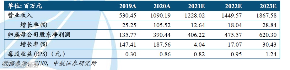 基于以上观点,我们预计公司2021-2023年的营业收入分别为12.28亿元、14.50亿元和18.68亿元,归母净利润分别为4.06亿元、4.76亿元及6.20亿元,EPS分别为0.82元、0.95元、1.24元,我们给予目标价格32.96元,分别对应40倍、35倍及27倍PE。