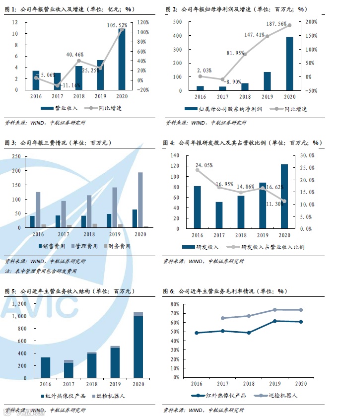 我们认为,在巡检机器人领域,公司布局较早,目前已具有市场先发优势,在我国新基建战略的不断推进以及电力行业持续朝向智能化及免维护化方向的发展背景下,市场对公司巡检机器人产品的需求有望快速增长,从公司2020年巡检机器人库存量(35台,+191.67%)有所上升来看,或表明了未来公司巡检机器人订单较充足,有望兑现至业绩,同时,由于巡检机器人中的技术多为公司在红外、光电惯导等领域技术储备的整合,未来公司该业务的毛利率也有望继续维持在较高水平。