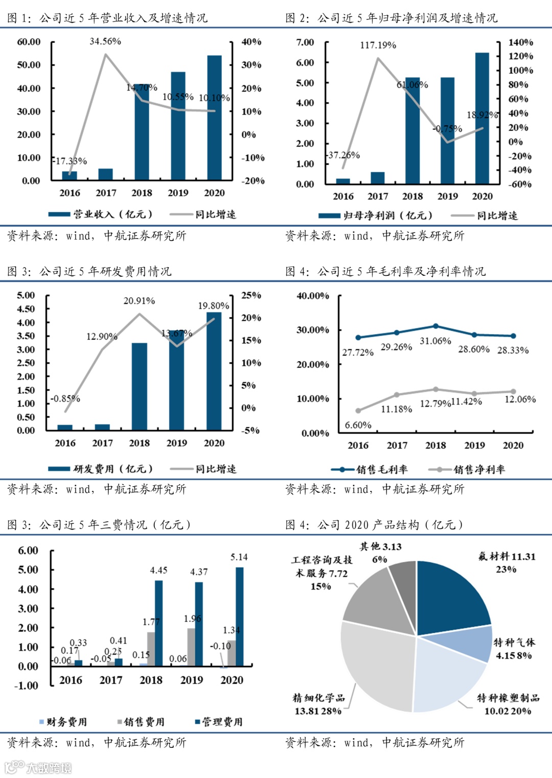 公司2020年营收、归母净利润同比增长10.10%和18.92%,实现平稳增长,主要系公司氟化工业务和催化剂业务销售增加,以及航空新材料业务快速增长带动所致。2020年公司加大成本费用优化控制,实施降本增利等行动,公司三费占比进一步下降(11.76%,-1.83pcts),净利率(12.06%)同比增长0.64pcts,从具体业务来看: