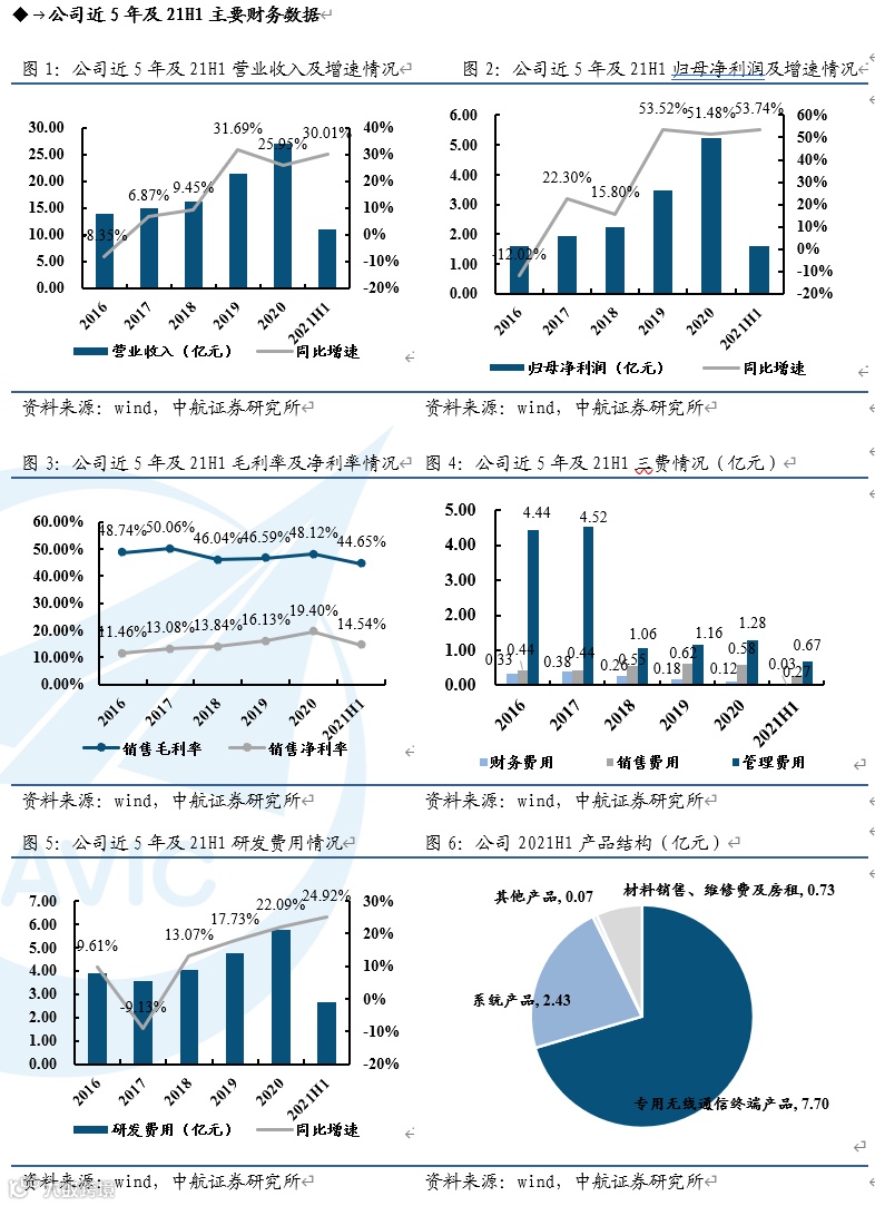 公司是我国专网无线通信产品和整体解决方案的核心供应商,公司始终服务于国家及国防战略,专注推进我国专网无线通信行业发展,主营业务覆盖军用无线通信、民用无线通信两大领域。从2021H1合同产生的具体收入来看:①专用无线通信终端产品收入7.70亿;②系统产品收入2.43亿;③其他产品收入722.27万;④材料销售、维修费及房租收入0.73亿。