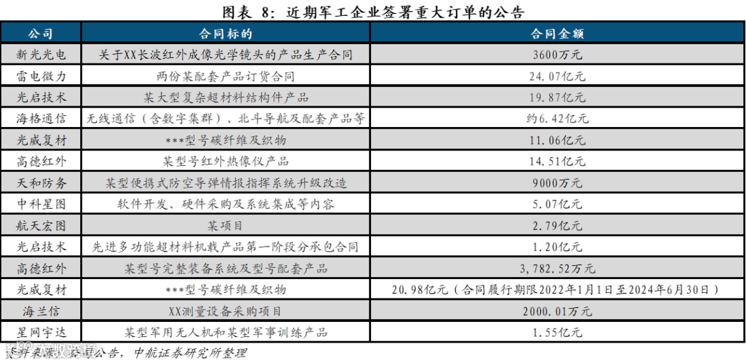 另外,部分军工企业大单落地,如新光光电、雷电微力、光启技术、海格通信、光威复材、高德红外、天海防务、中科星图、航天宏图、海兰信、星网宇达等。